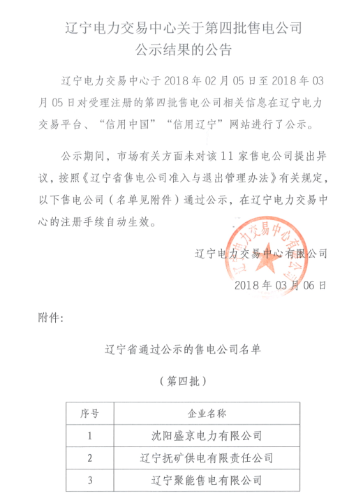 遼寧電力交易中心日前發(fā)布了關(guān)于第四批售電公司公示結(jié)果的公告,公告中稱(chēng),公示期間,市場(chǎng)有關(guān)方面未對(duì)公示的11家售電公司提出異議,注冊(cè)手續(xù)自動(dòng)生效。詳情如下: