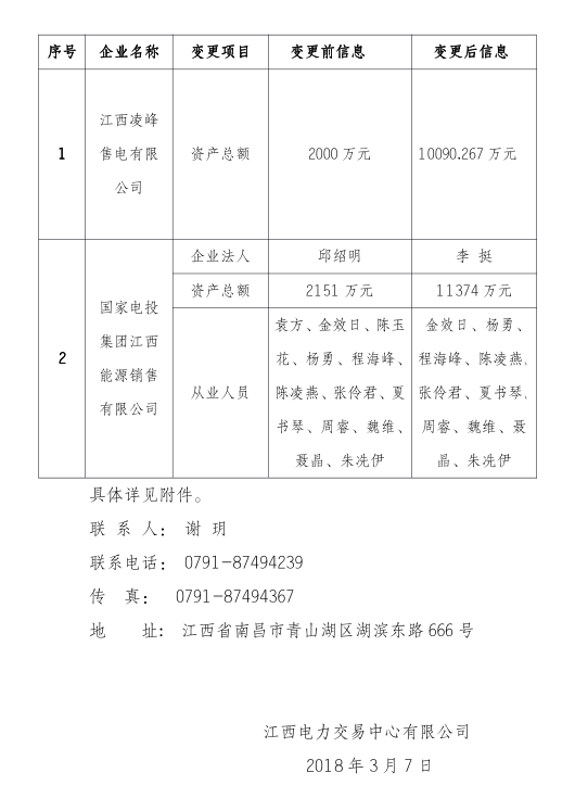 江西電力交易中心日前發(fā)布了《關(guān)于公示受理注冊信息變更的售電公司相關(guān)信息的公告》,公告中稱,江西電力交易中心受理了2家售電公司的注冊信息變更申請,公示期為2018年3月7日至2018年4月6日,時間1個月。詳情如下: