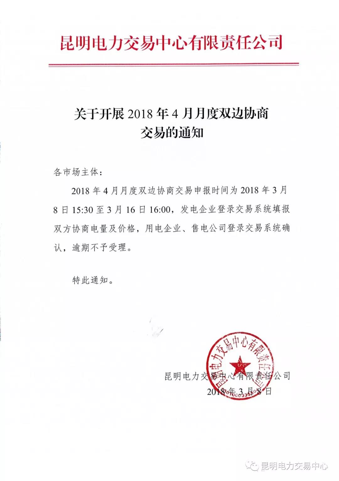 昆明電力交易中心日前發(fā)布了《關(guān)于開(kāi)展2018年4月月度雙邊協(xié)商交易的通知》,通知中稱,4月月度雙邊協(xié)商交易申報(bào)時(shí)間為3月8日15:30至3月16日16:00。詳情如下: