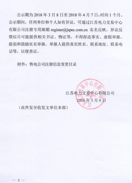 江蘇電力交易中心日前發(fā)布了《關(guān)于公示售電公司注冊信息變更的公告》,公告中稱,江蘇電力交易中心公示受理了5家售電公司提交的注冊信息變更申請,公示期為3月8日至4月7日,時間1個月。