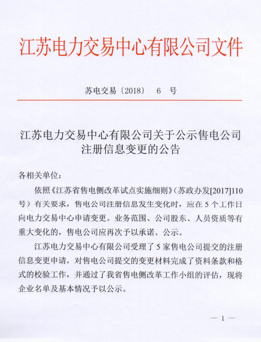 江蘇公示5家注冊信息變更的售電公司