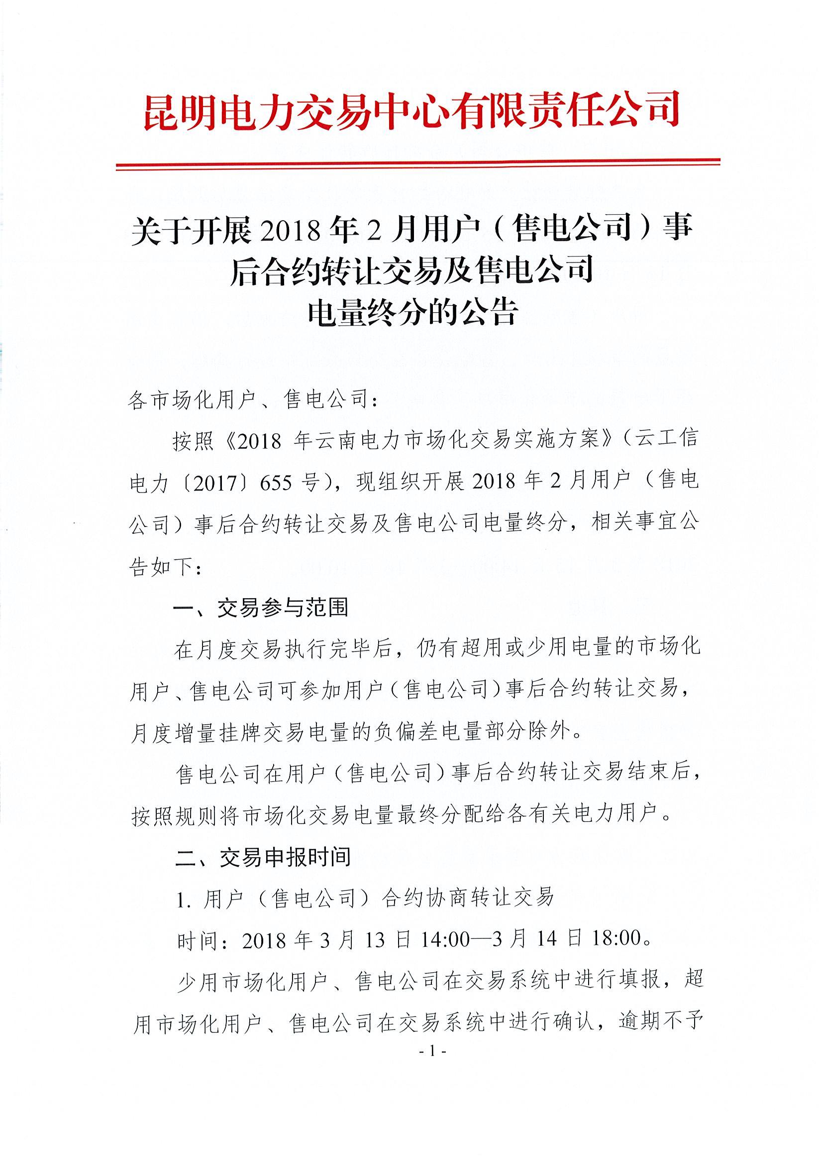 云南2月用戶(售電公司)事后合約轉讓交易及售電公司電量終分展開