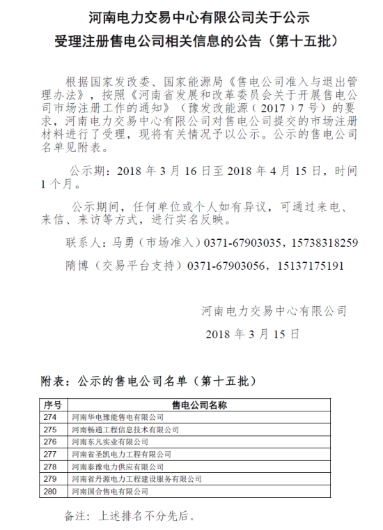 河南電力交易中心日前發(fā)布了《關(guān)于公示受理注冊售電公司相關(guān)信息的公告(第十五批)》,有7家售電公司在名單內(nèi),公示期為2018年3月6日至2018年4月15日,時間1個月。