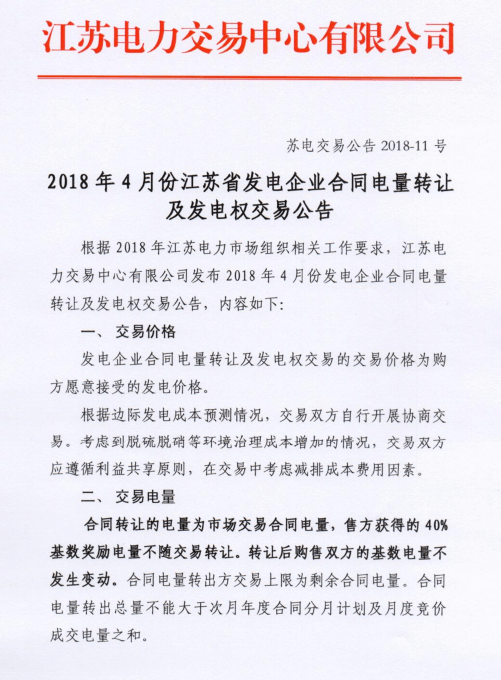 4月江蘇省發(fā)電企業(yè)合同電量轉(zhuǎn)讓及發(fā)電權(quán)交易26日展開