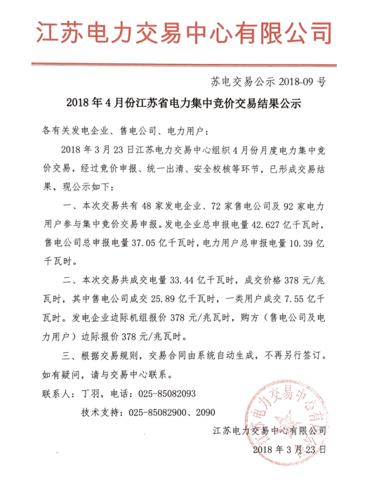 江蘇電力交易中心日前發(fā)布了《2018年4月份江蘇省電力集中競價交易結果公示》,本次交易共有48家發(fā)電企業(yè)、72家售電公司及92家電力用戶參與集中競價交易申報。共成交電量33.44億千瓦時,成交價格378元/兆瓦時,其中售電公司成交25.89億千瓦時,一類用戶成交7.55億千瓦時。