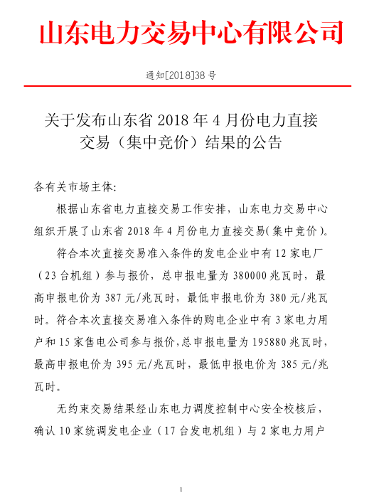 山東電力交易中心日前發(fā)布了《山東省2018年4月份電力直接交易(集中競(jìng)價(jià))結(jié)果》,確認(rèn)10家統(tǒng)調(diào)發(fā)電企業(yè)(17臺(tái)發(fā)電機(jī)組)與2家電力用戶及15...