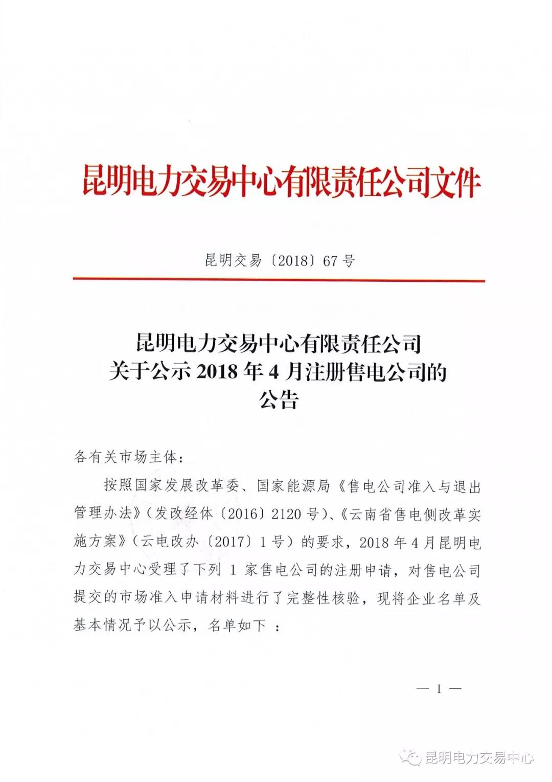 昆明電力交易中心有限責(zé)任公司關(guān)于公示2018年4月注冊售電公司的公告