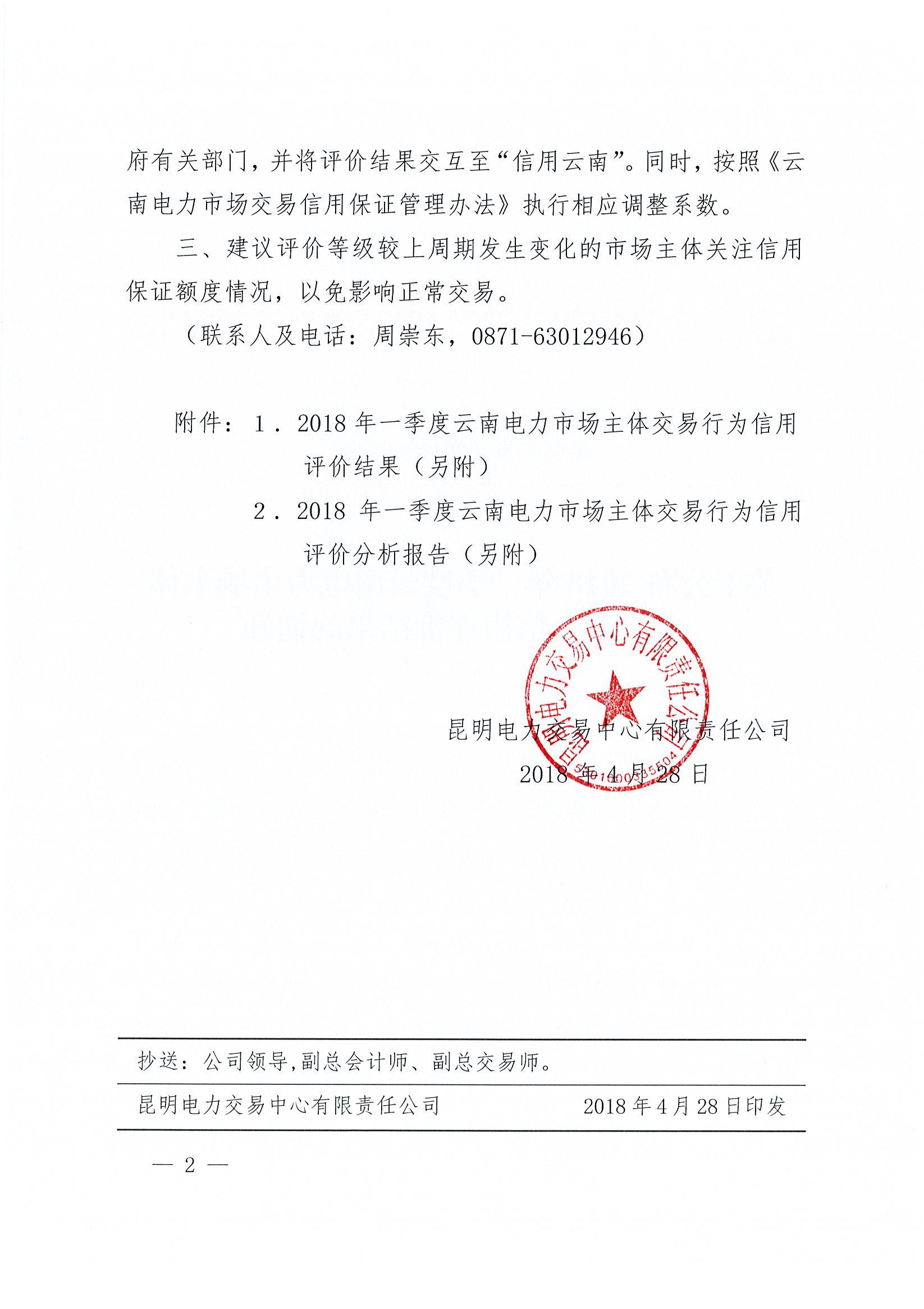 2018 年一季度云南電力市場(chǎng)主體交易行為信用評(píng)價(jià)結(jié)果