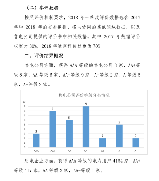 售電公司方面,獲得AAA等級(jí)的售電公司3家,AA+等級(jí)8家,AA等級(jí)6家,AA-等級(jí)9家,A+T等級(jí)2家,A等級(jí)5家,A-等級(jí)2家。