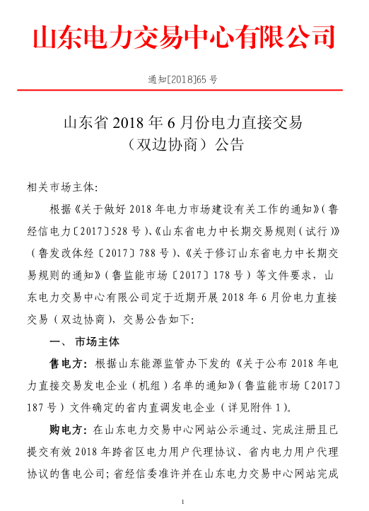 山東電力交易中心日前發(fā)布了《山東省2018年6月份電力直接交易(雙邊協(xié)商)公告,交易標(biāo)的:售電公司,代理的全部電力用戶2018年6月份用電量減去已簽訂省外和省內(nèi)購電合同當(dāng)月電量后的所有或部分用電缺額。自主參與交易的電力用戶:2018年6月份用電量減去已簽訂省外和省內(nèi)購電合同當(dāng)月電量后的所有或部分用電缺額。