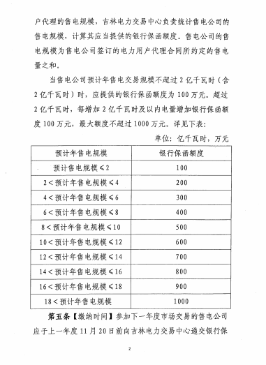 吉林電力交易中心日前公布了《吉林省電力市場交易售電公司履約保函管理辦法(暫行)》,辦法規(guī)定,參與吉林電力市場交易的售電公司應(yīng)當(dāng)于每年10月20日前向吉林電力交易中心提供與電力用戶代理的售電規(guī)模,計算其應(yīng)當(dāng)提供的銀行保函額度。售電公司的售電規(guī)模為售電公司簽訂的電力用戶代理合同所約定的售電量之和。當(dāng)售電公司預(yù)計年售電交易規(guī)模不超過2億千瓦時(含2億千瓦時)時,應(yīng)提供的銀行保函額度為100萬元。超過2億千瓦時,每增加2億千瓦時及以內(nèi)電量增加銀行保函額度為100萬元,最大額度不超過1000萬元。
