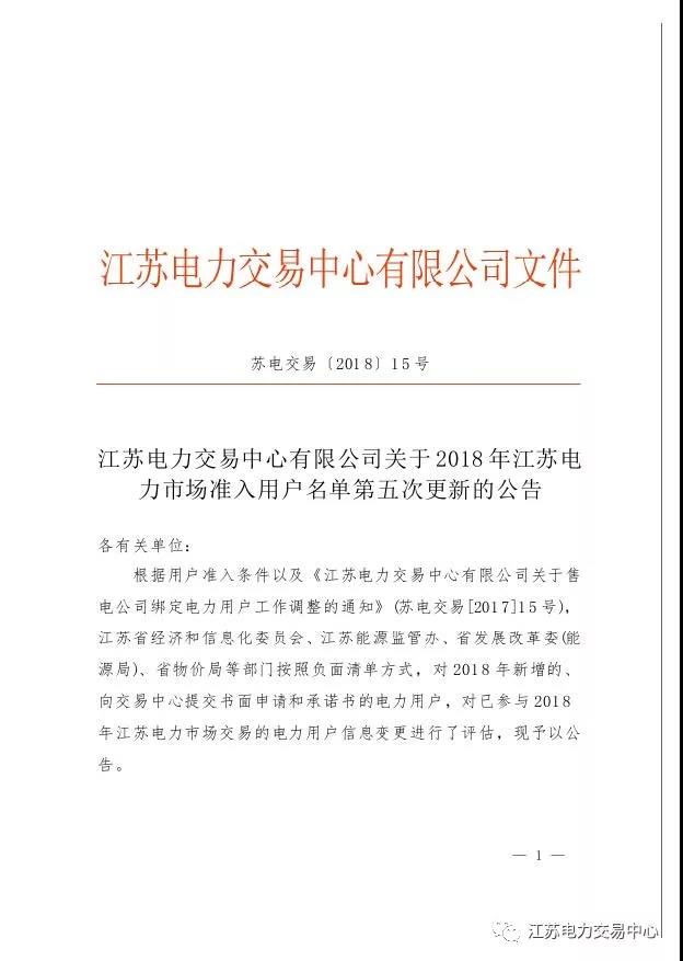 關(guān)于2018年江蘇電力市場準(zhǔn)入用戶名單第五次更新的公告