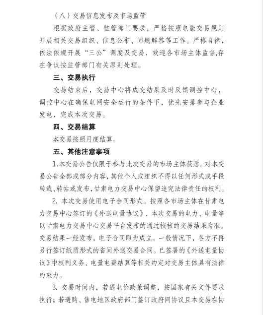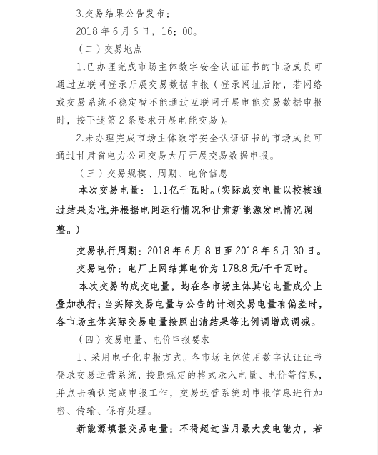 甘肅電力交易中心日前發(fā)布了《2018年6月甘肅送江西月度省間外送交易公告》,本次交易電量:1.1億千瓦時(shí)。( 實(shí)際成交電量以校核通過(guò)結(jié)果為準(zhǔn), 并根據(jù)電網(wǎng)運(yùn)行情況和甘肅新能源發(fā)電情況調(diào)整。)交易執(zhí)行周期:2018 年6月8日至2018年6月30日。交易電價(jià):電廠上網(wǎng)結(jié)算電價(jià)為178. 8元/ 千千瓦時(shí)。本次交易的成交電量,均在各市場(chǎng)主體其它電量成分上疊加執(zhí)行; 當(dāng)實(shí)際交易電量與公告的計(jì)劃交易電量有偏差時(shí) ,各市場(chǎng)主體實(shí)際交易電量按照出清結(jié)果等比例調(diào)增或調(diào)減。詳情如下: