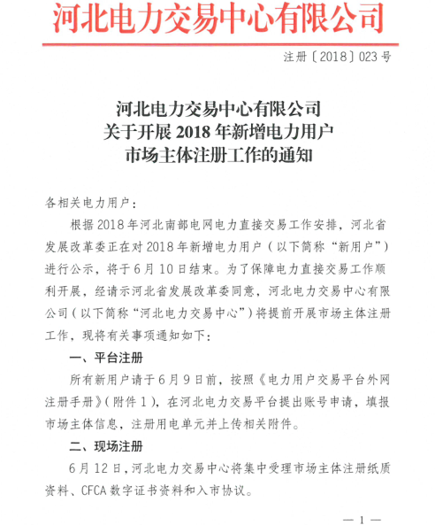 近日,河北電力交易中心有限公司關于開展2018年新增電力用戶市場主體注冊工作的通知,通知包含市場主體注冊使用手冊、河北南部電網(wǎng)市場主體...