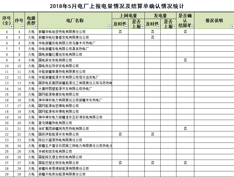 新疆2018年5月497家發(fā)電企業(yè)上報(bào)電量情況及結(jié)算單確認(rèn)情況的通報(bào) (附詳單)