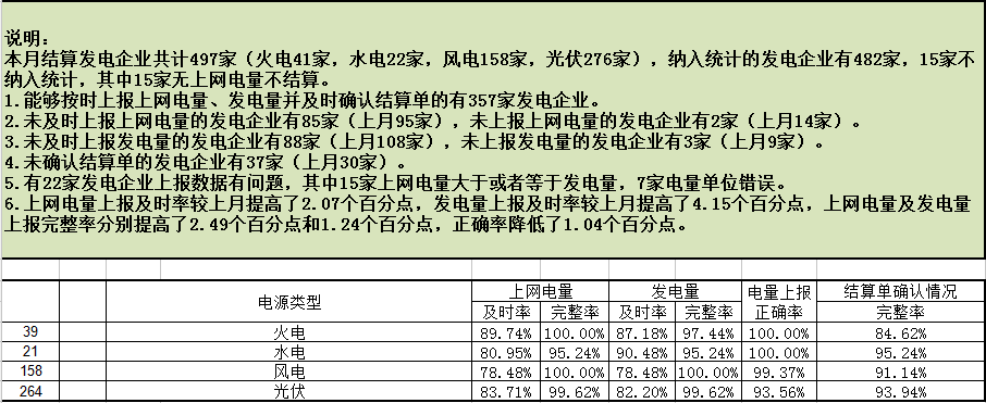 7、本月上網(wǎng)電量上報(bào)及時(shí)率為82.37%,完整率為99.59%,發(fā)電量上報(bào)及時(shí)率為81.74%,完整率為99.38%。電量上報(bào)正確率為96.27%,結(jié)算單確認(rèn)完整率為92.32%。本月上網(wǎng)電量上報(bào)及時(shí)率較上月提高了2.07個(gè)百分點(diǎn),發(fā)電量上報(bào)及時(shí)率較上月提高了4.15個(gè)百分點(diǎn),上網(wǎng)電量及發(fā)電量上報(bào)完整率分別提高了2.49個(gè)百分點(diǎn)和1.24個(gè)百分點(diǎn),正確率降低了1.04個(gè)百分點(diǎn)。