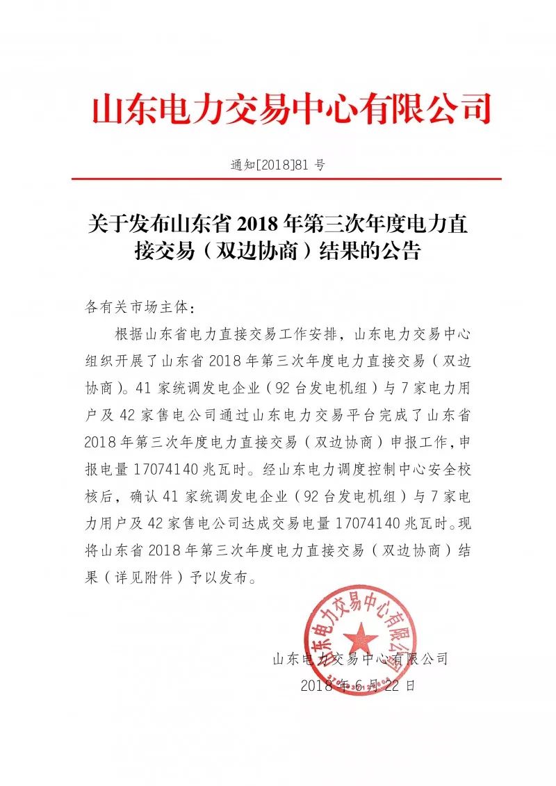 山東2018年第三次年度電力直接交易(雙邊協(xié)商)交易電量1700萬(wàn)兆瓦時(shí)