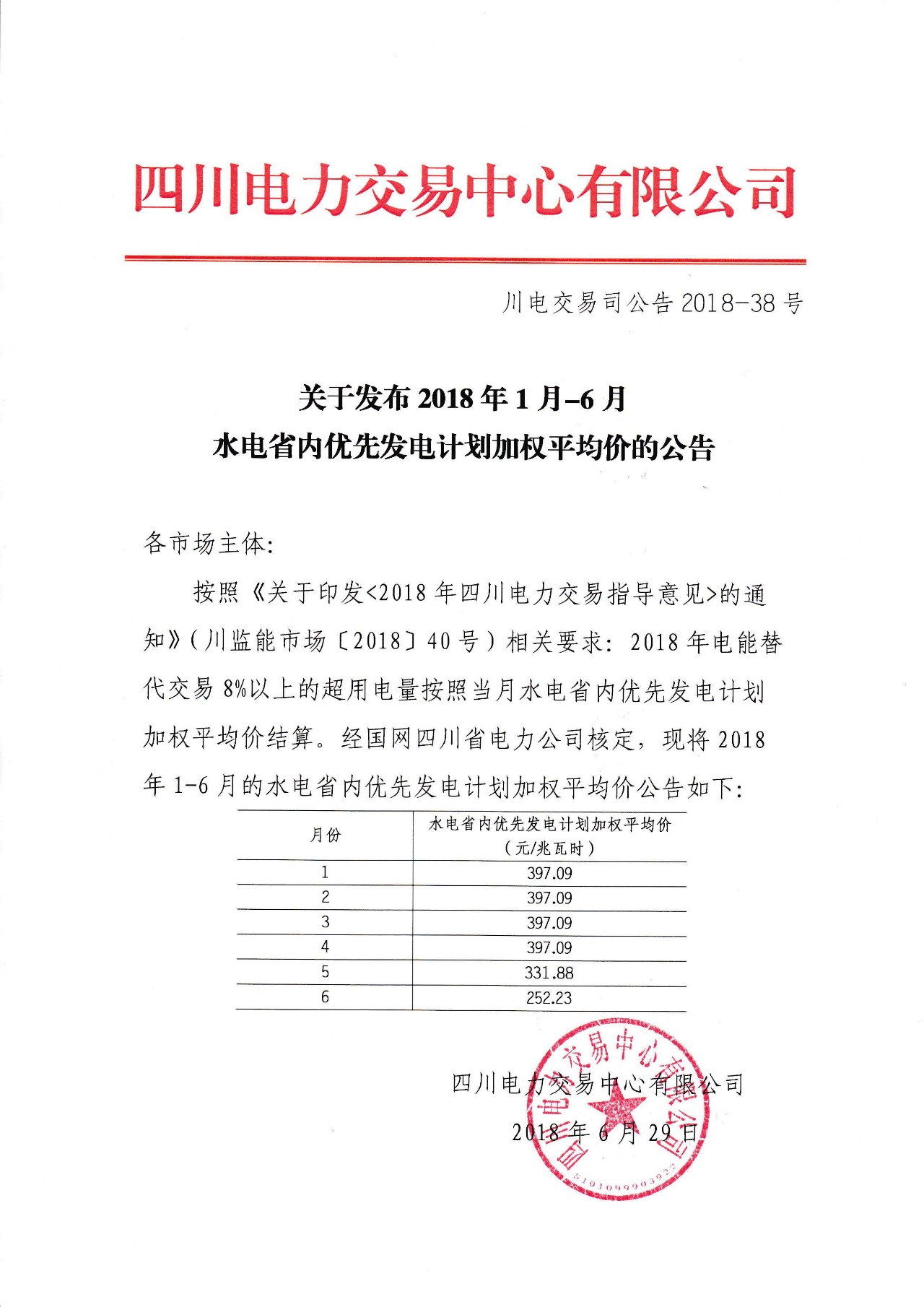四川發(fā)布2018年1月-6月水電省內優(yōu)先發(fā)電計劃加權平均價的公告