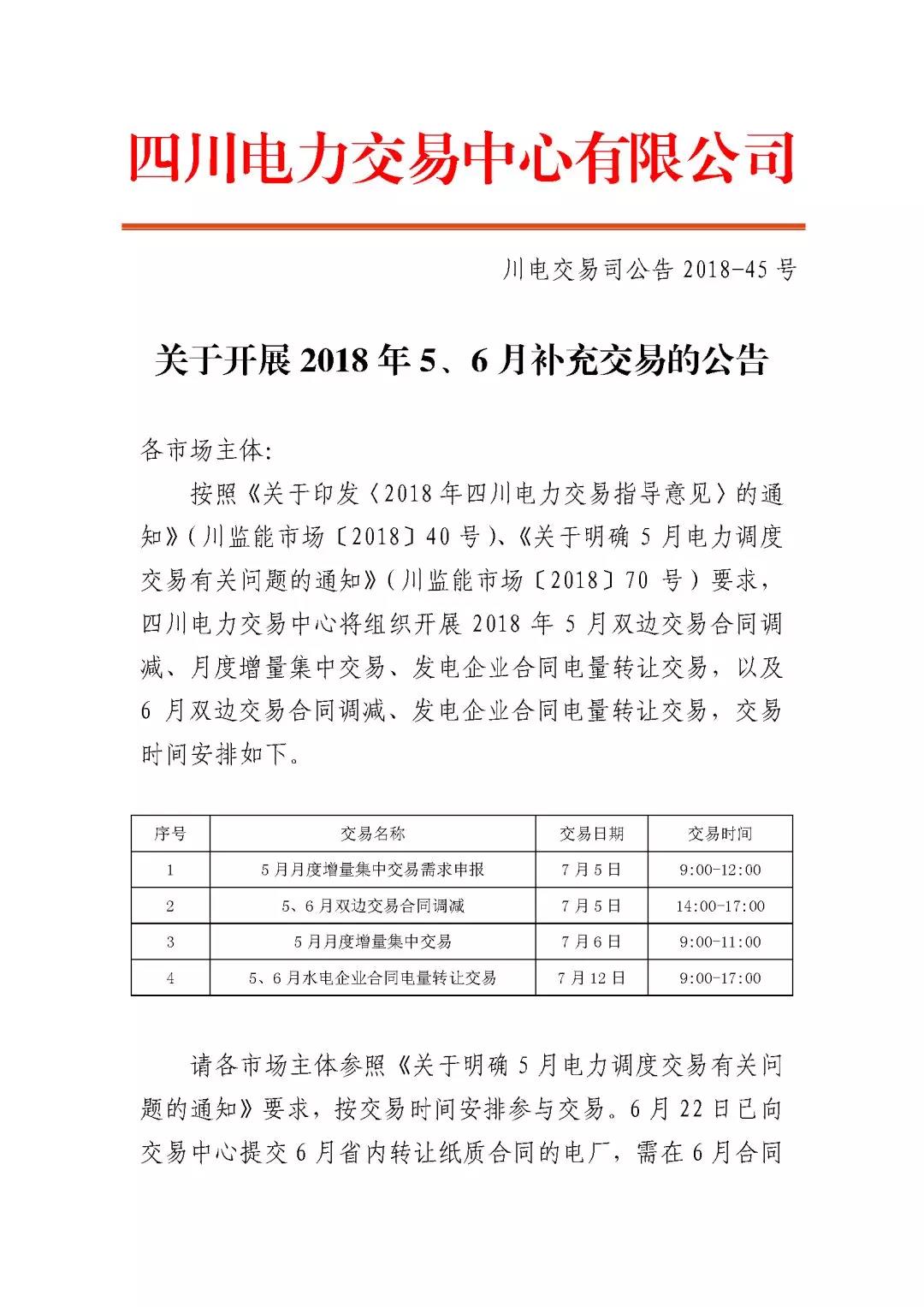 四川關(guān)于開展2018年5、6月補(bǔ)充交易的公告