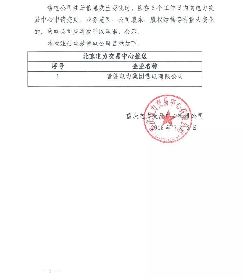 公示期間,市場(chǎng)有關(guān)方面未對(duì)該售電公司提出異議,晉能電力集團(tuán)售電有限公司在重慶電力交易中心有限公司注冊(cè)手續(xù)自動(dòng)生效,納入重慶市售電公司目錄。