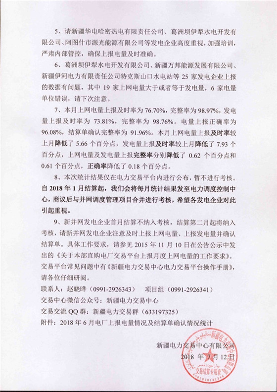 新疆發(fā)布2018年6月發(fā)電企業(yè)上報(bào)電量情況及結(jié)算單確認(rèn)情況的通報(bào)