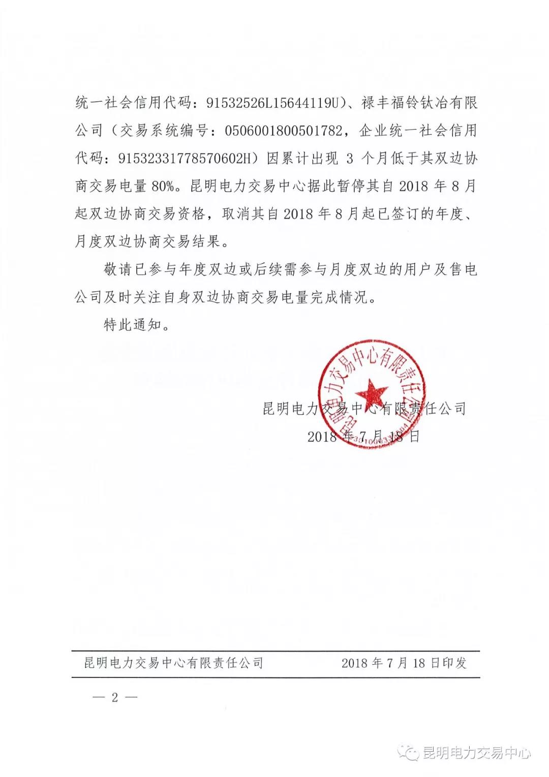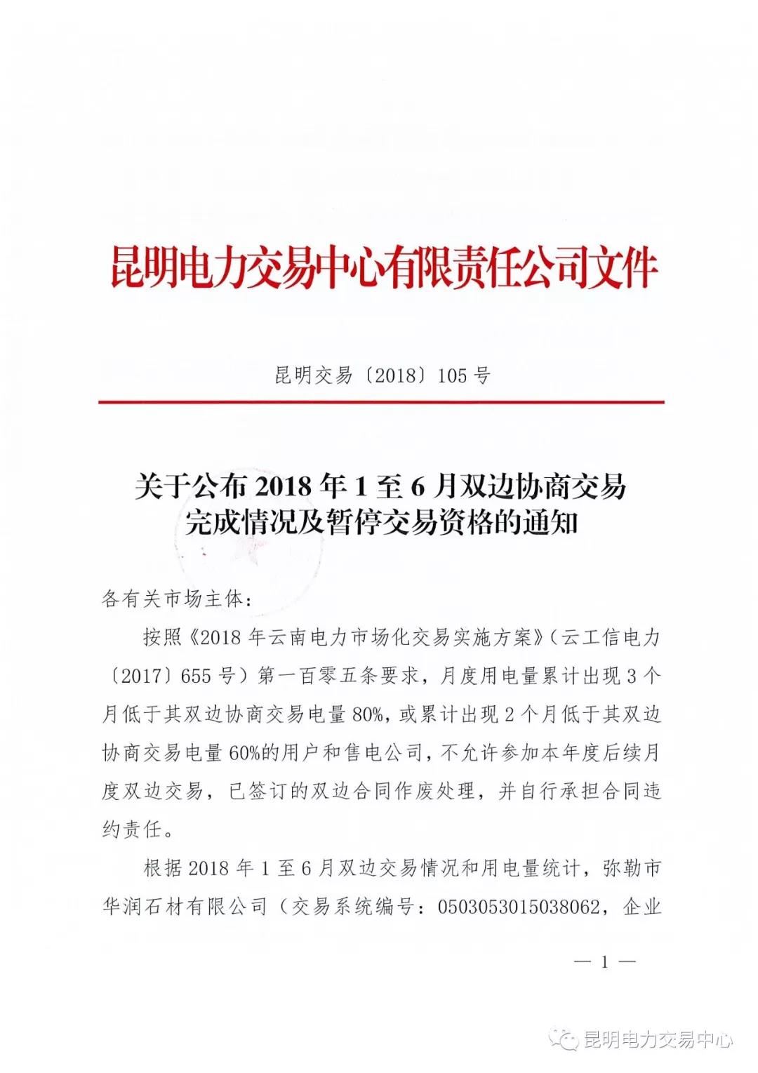 云南關(guān)于公布2018年1至6月雙邊協(xié)商交易完成情況及暫停交易資格的通知