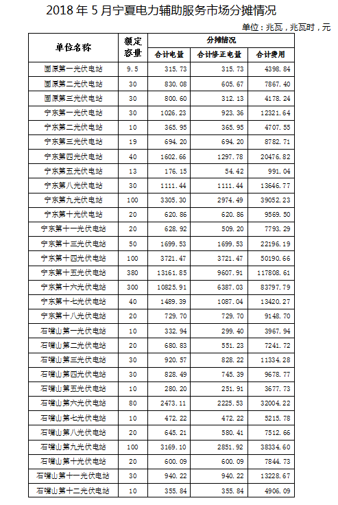 關(guān)于公布2018年5月份寧夏電力輔助服務(wù)市場補(bǔ)償分?jǐn)偳闆r的通知