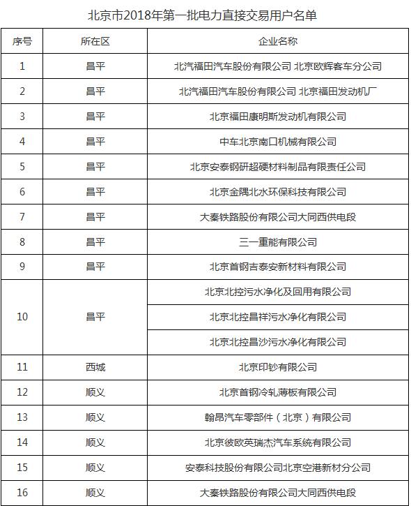 北京市城市管理委員會(huì)關(guān)于發(fā)布北京市2018年第一批電力直接交易用戶名單的通知