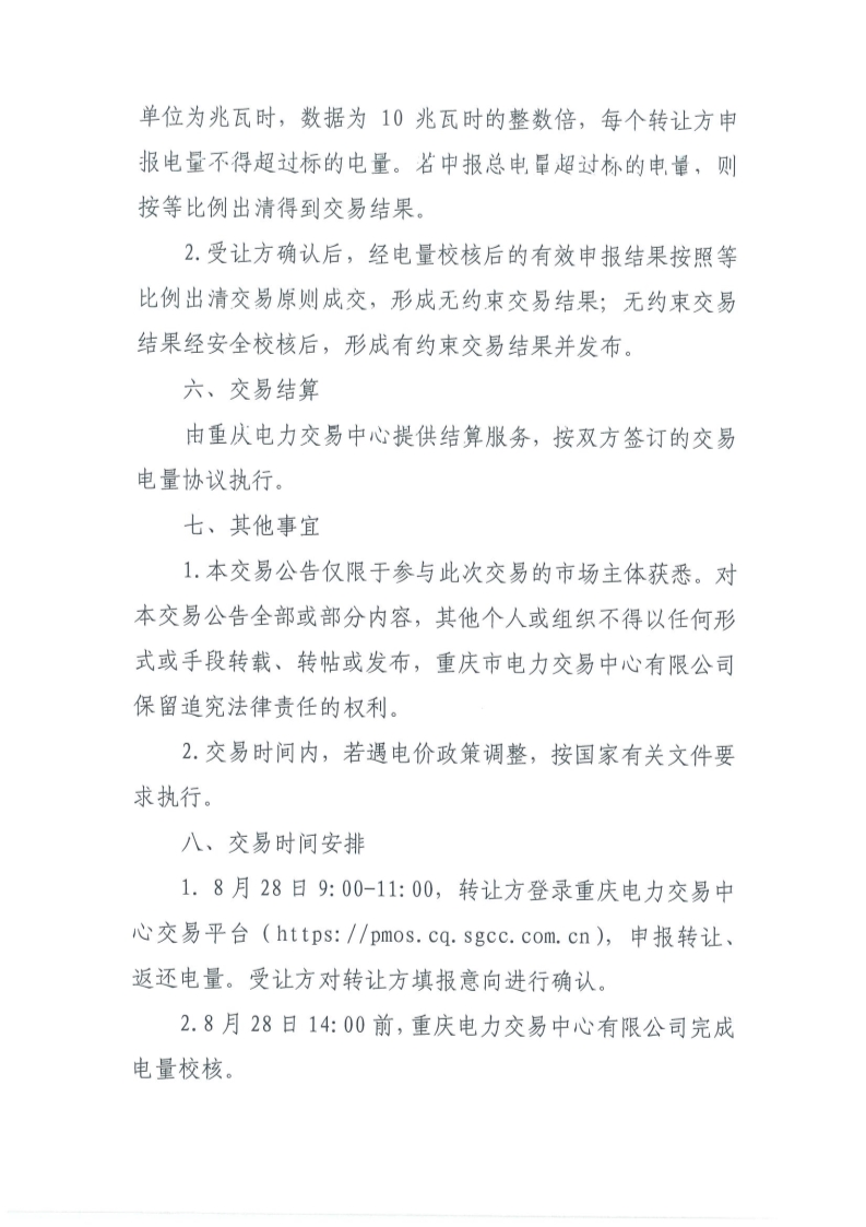 重慶電力交易中心日前發(fā)布了《2018年9月重慶市內(nèi)發(fā)電權(quán)交易公告》, 本次交易采取雙邊方式組織,8月28日9:00-11:00,轉(zhuǎn)讓方登錄重慶電力交易中心交易平臺(tái)申報(bào)轉(zhuǎn)讓、返還電量。受讓方對(duì)轉(zhuǎn)讓方填報(bào)意向進(jìn)行確認(rèn)。