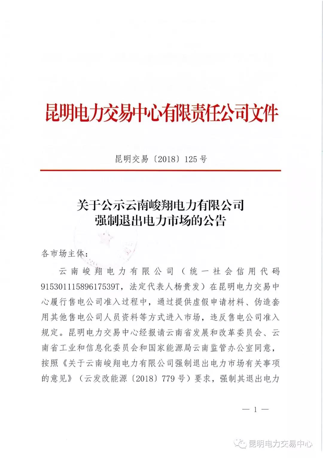 昆明電力交易中心經報請云南省發(fā)展和改革委員會、云南省工業(yè)和信息化委員會和國家能源局云南監(jiān)管辦公室同意,按照《關于云南峻翔電力有限公司強制退出電力市場有關事項的意見》(云發(fā)改能源(2018〕779號)要求,強制其退出電力市場,并在3年內禁止其進行售電公司準入(含同一法定代表人的公司)。
