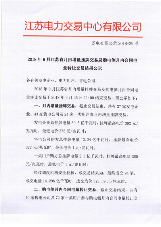 江蘇電力交易中心今日發(fā)布了《2018年9月江蘇省月內(nèi)增量掛牌及購電側(cè)月內(nèi)合同電量轉(zhuǎn)讓交易結(jié)果公示》,共有37家發(fā)電企業(yè)、43家售電公司及24家一類用戶參月內(nèi)增量掛牌交易,成交電量14.296億千瓦時,成交均價373.59元/兆瓦時;40家售電公司及72家一類用戶參與購電側(cè)月內(nèi)合同電量轉(zhuǎn)讓交易,成交電量3.02億千瓦時,成交均價374.68元/兆瓦時。