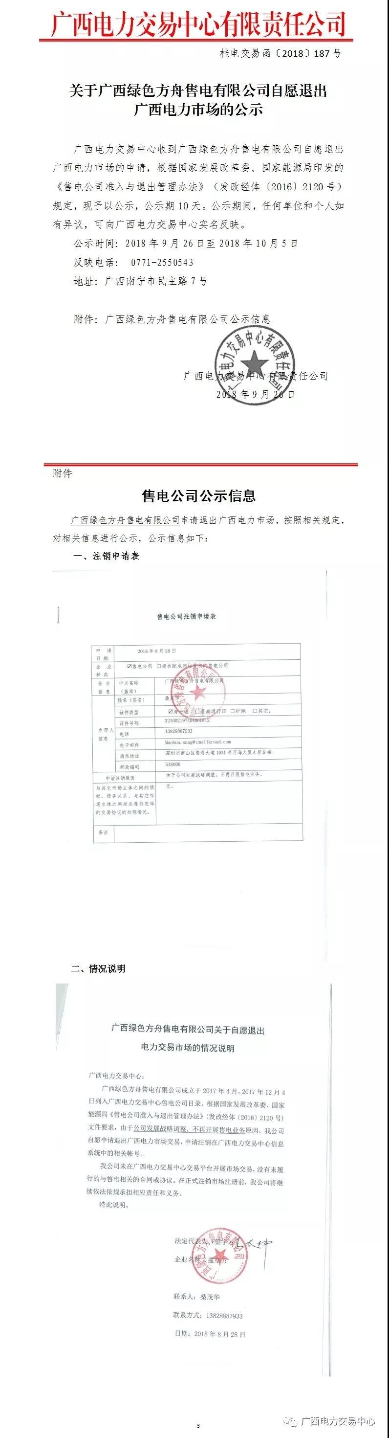 關于廣西綠色方舟售電有限公司自愿退出電力市場的公示