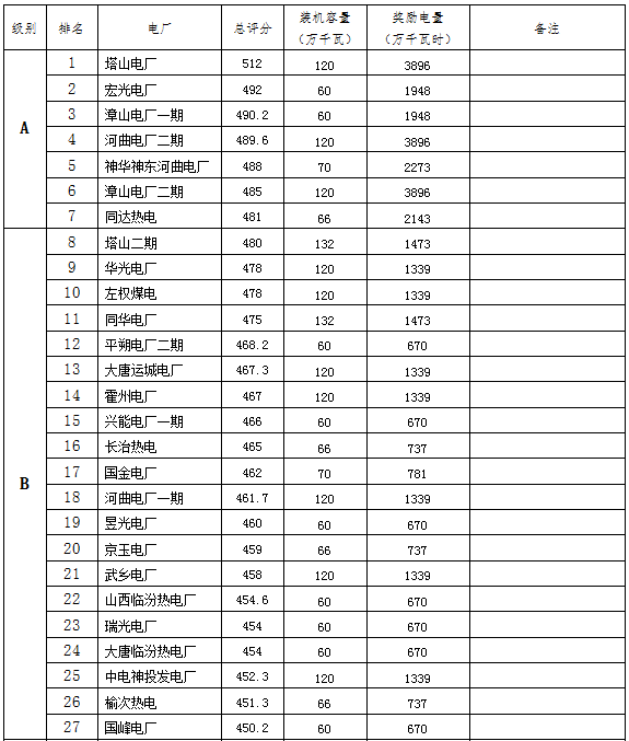 在每個獎勵周期內(nèi),由省電力調(diào)度控制中心對本周期內(nèi)省調(diào)火電燃煤機(jī)組運(yùn)行情況進(jìn)行考核評分,按照經(jīng)公示無異議的最終評分結(jié)果,將參與考核評分的企業(yè)按總分劃分為A、B、C、D四個等級,其中A級為排名前10%的企業(yè),B級為排名10%—40%的企業(yè),C級為排名40%—70%,D級為排名后30%的企業(yè),各級別企業(yè)個數(shù)均按四舍五入取整數(shù)。