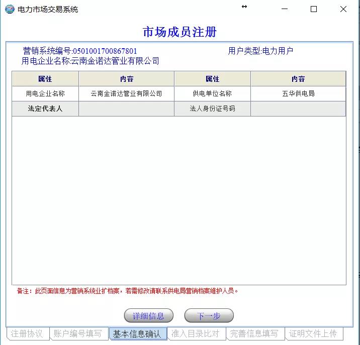 如果基本信息及詳細(xì)信息(計(jì)量點(diǎn)信息)有誤,請(qǐng)聯(lián)系供電局營銷系統(tǒng)人員更改相關(guān)信息,并點(diǎn)擊右上方的“×”退出本次注冊(cè)流程,待營銷系統(tǒng)變更信息后,重新開始注冊(cè)。如果確認(rèn)信息無誤,請(qǐng)點(diǎn)擊“下一步”按鈕繼續(xù)本次注冊(cè)。
