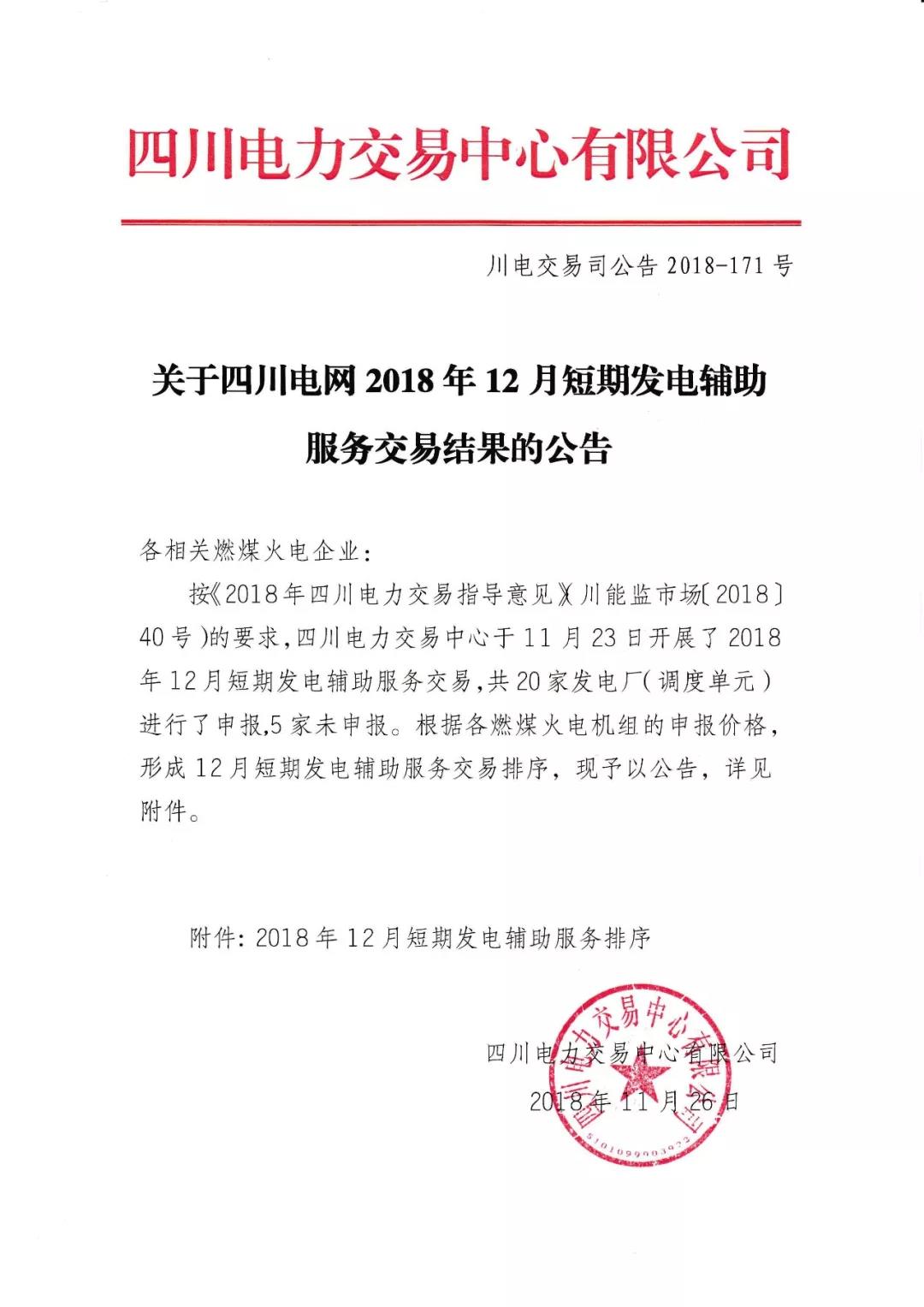 公告 | 關(guān)于四川電網(wǎng)2018年12月短期發(fā)電輔助服務(wù)交易結(jié)果的公告