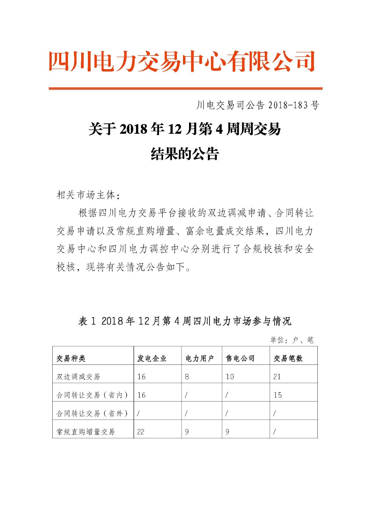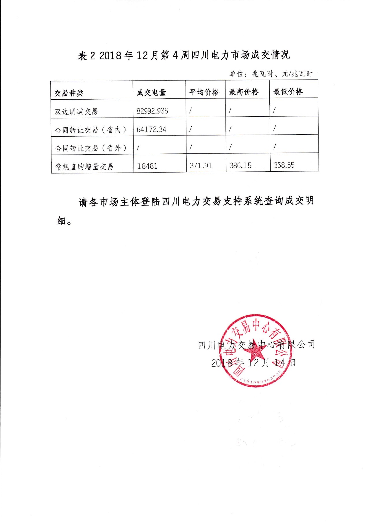 四川電力交易中心日前發(fā)布了《關(guān)于2018年12月第4周周交易結(jié)果的公告》