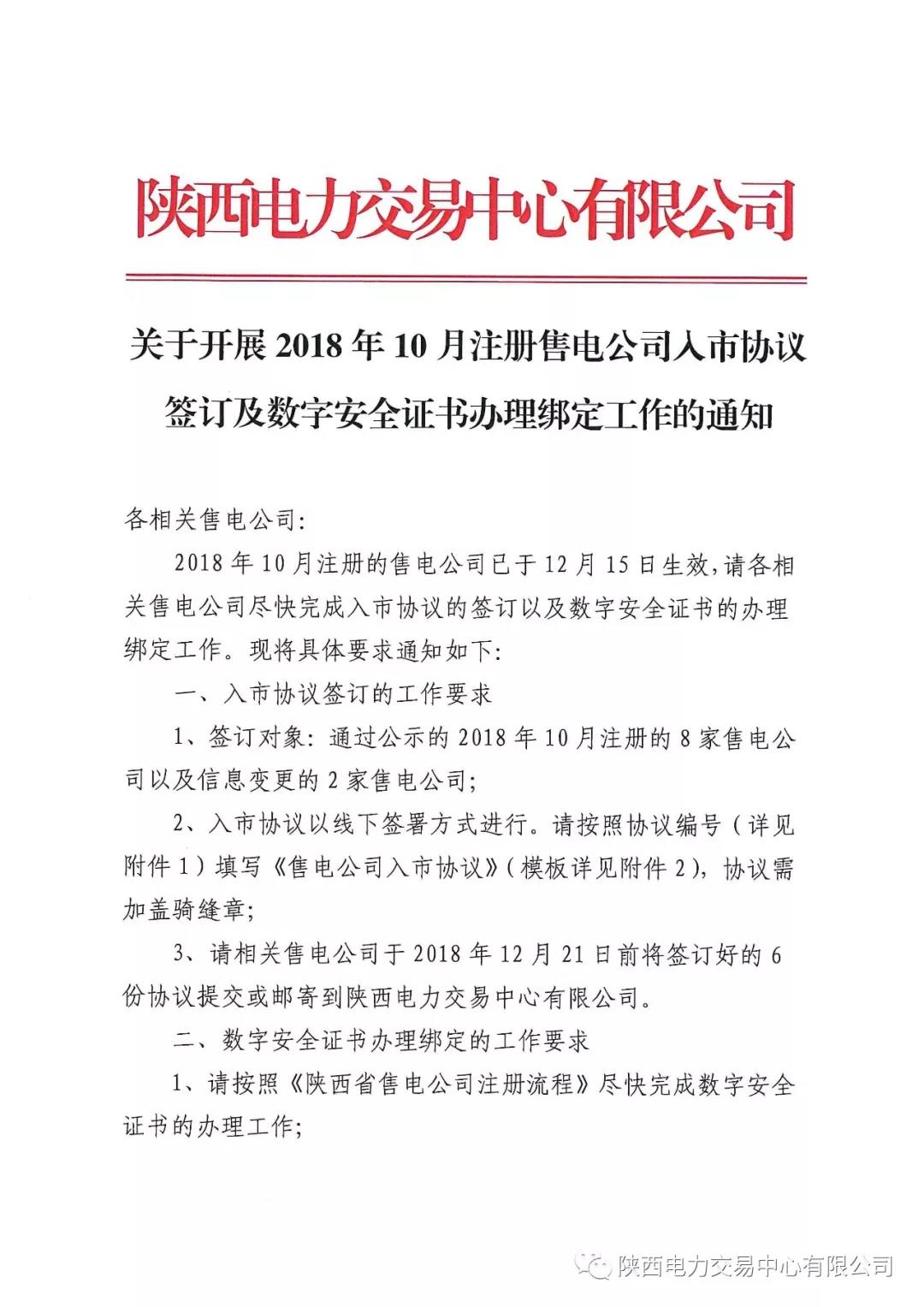 陜西電力交易中心關(guān)于開展2018年10月注冊售電公司入市協(xié)議簽訂及數(shù)字安全證書辦理綁定工作的通知