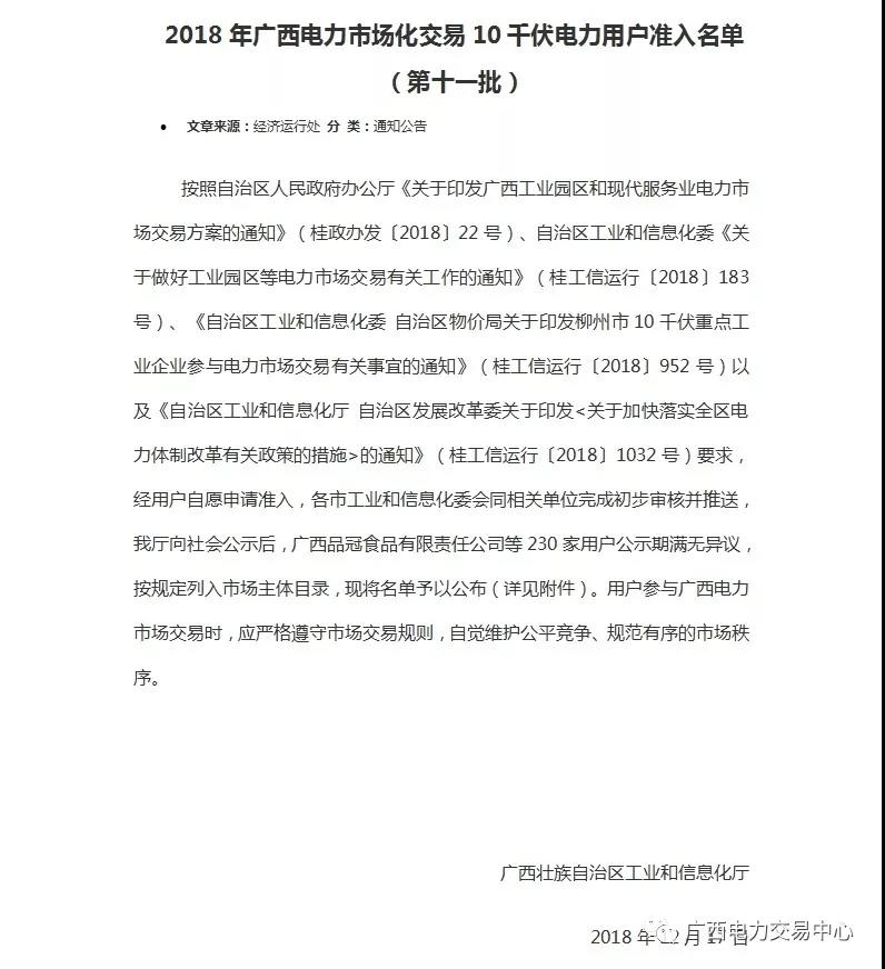 轉(zhuǎn)發(fā)自治區(qū)工信委《2018年廣西電力市場(chǎng)化交易10千伏電力用戶準(zhǔn)入名單(第十一批)》的通知