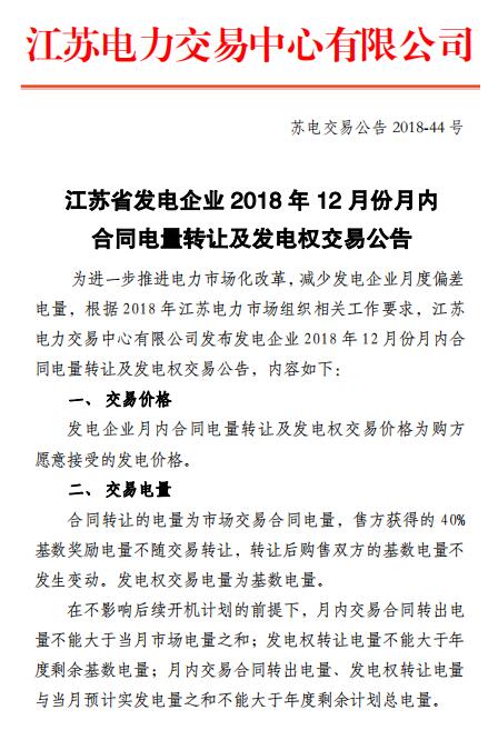 江蘇電力交易中心日前發(fā)布了《江蘇發(fā)電企業(yè)2018年12月份月內(nèi)合同電量轉(zhuǎn)讓及發(fā)電權(quán)交易公告》