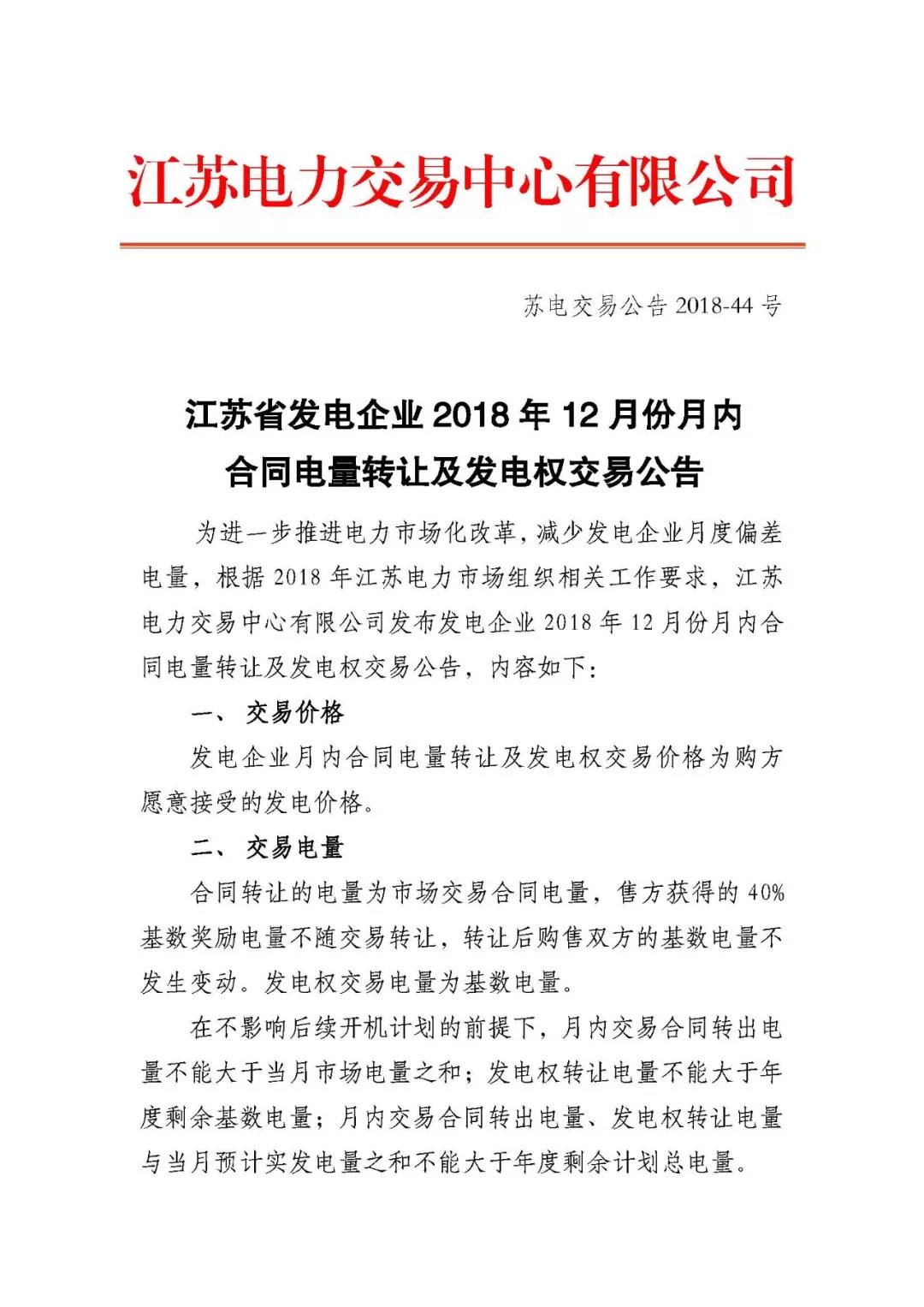 江蘇省發(fā)電企業(yè)2018年12月份月內(nèi)合同電量轉(zhuǎn)讓及發(fā)電權(quán)交易公告