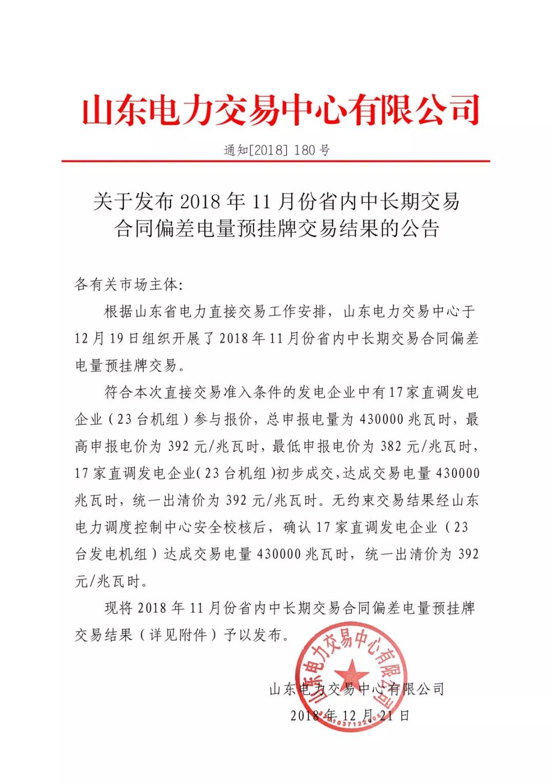 山東電力交易中心日前發(fā)布了《關(guān)于發(fā)布2018年11月份省內(nèi)中長期交易合同偏差電量預(yù)掛牌交易結(jié)果的公告》