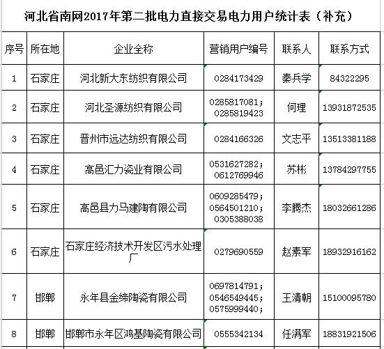 河北南網(wǎng)2017第二批電力直接交易準(zhǔn)入企業(yè)名單(補(bǔ)充)公示