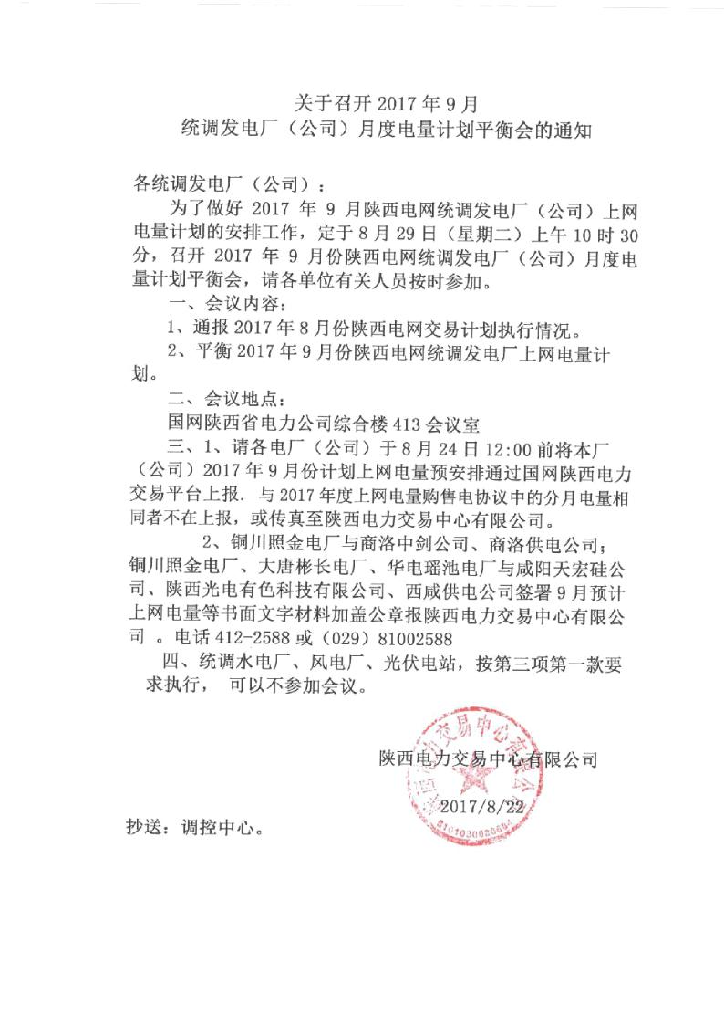 從陜西電力交易中心獲悉,陜西電力交易中心日前發(fā)布了關(guān)于召開2017年9月統(tǒng)調(diào)發(fā)電廠(公司)月度電量計劃平衡會的通知。為了做好2017年9月陜西電網(wǎng)統(tǒng)調(diào)發(fā)電廠(公司)上網(wǎng)電量計劃的安排工作,定于8月29日(星期二)上午10時30分,召開2017年9月份陜西電網(wǎng)統(tǒng)調(diào)發(fā)電廠(公司)月度電量計劃平衡會。