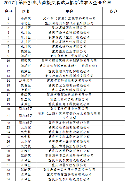 重慶市2017年第四批電力直接交易試點新增準(zhǔn)入企業(yè)公示名單