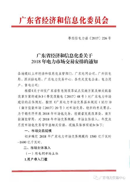 9月30日,廣東省經(jīng)濟(jì)和信息化委員會(huì)對(duì)2018年市場(chǎng)交易規(guī)模、市場(chǎng)主體準(zhǔn)入、年度及月度市場(chǎng)化交易等作出相關(guān)安排,通知正文如下:
