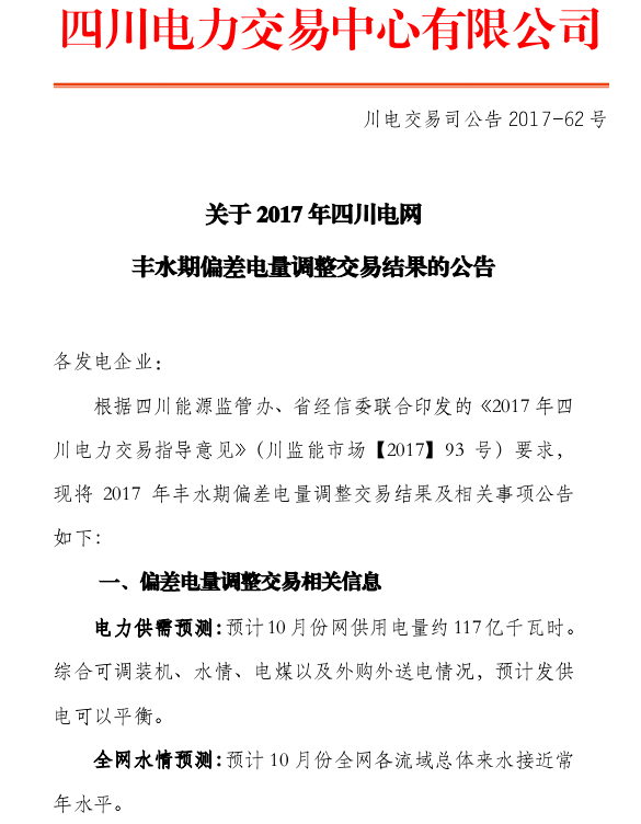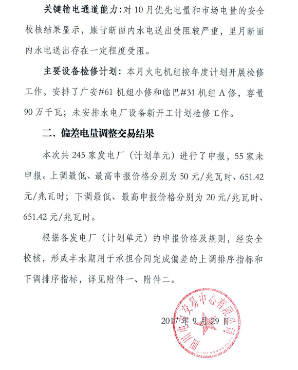 近日四川電力交易中心發(fā)布關于2017年四川電網豐水期偏差電量調整交易結果的公告。此次調整共245家發(fā)電廠(計劃單元)進行了申報,55家未申報。上調最低、最高申報價格分別為50元 兆瓦時、651 42元 兆瓦時;下調最