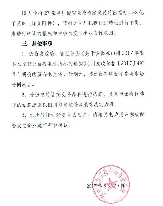 為確保合同電量轉(zhuǎn)讓與啟動上下調(diào)的有序銜接,四川電力交易中心發(fā)布10月份市場合同轉(zhuǎn)讓公告。并于2017年9月30日-10月9日,組織開展四川省2017年10月份市場合同轉(zhuǎn)讓交易,共計27家電廠因安全校核建議要轉(zhuǎn)出指標(biāo)5.92億千瓦時。