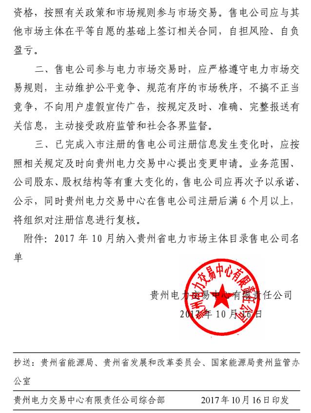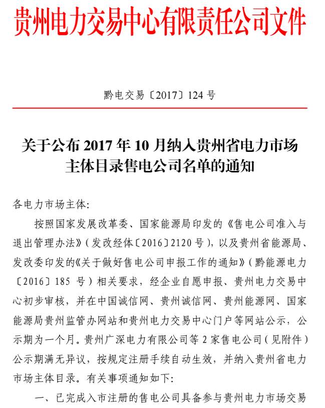 近日,貴州電力交易中心發(fā)布了關(guān)于公布2017年10月納入貴州省電力市場主體目錄售電公司名單的通知,貴州廣深電力有限公司等2家售電公司(見附件)公示期滿無異議,按規(guī)定注冊手續(xù)自動生效,并納入貴州電力市場主體目