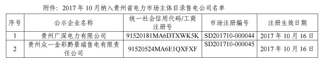 貴州新增售電公司2家(10月)