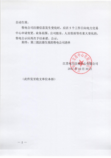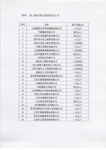 10月30日,江蘇電力交易中心于2017年9月30日至2017年10月29日對江蘇省第三批28家售電公司市場注冊申請材料進(jìn)行了公示,其中26家市場方面未提出異議,注冊手續(xù)自動(dòng)生效。